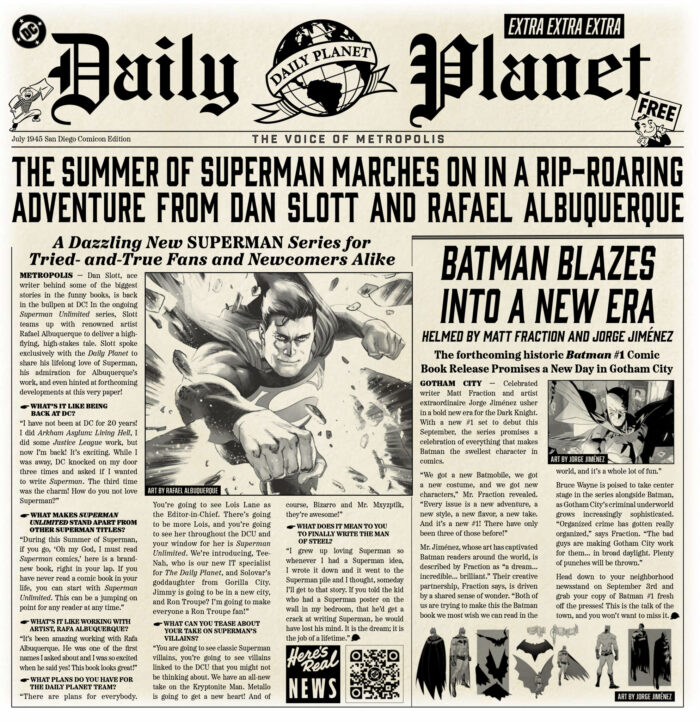 The free 1940s-style Daily Planet newspaper, complete with classic DC Comics ads pulled direct from DC’s comic book archives, served a dual-purpose to highlight DC’s panels and promotions while being a crowd-favorite way for fans to capture signatures from DC’s current comic book creators: Jim Lee, Bilquis Evely, Matheus Lopes, Tom King, Matt Fraction, Scott Snyder, Joshua Williamson, Nick Dragotta, Jeph Loeb, Mark Waid, and more, were all able to sign posters, comics, and copies of the Daily Planet as they came through the DC Booth. Fans shared optimism and enthusiasm about DC with comic book creators during high-profile meet-and-greet moments, with a lot of conversations centered around the success of “Superman” and the upcoming season of “Peacemaker.” During theSupergirl: Woman of Tomorrow (Tom King, Bilquis Evely and Matheus Lopes) signing, fans shared their excitement for DC Studios’ upcoming film “Supergirl,” following Kara’s cameo in “Superman,” with the comic book creative team.