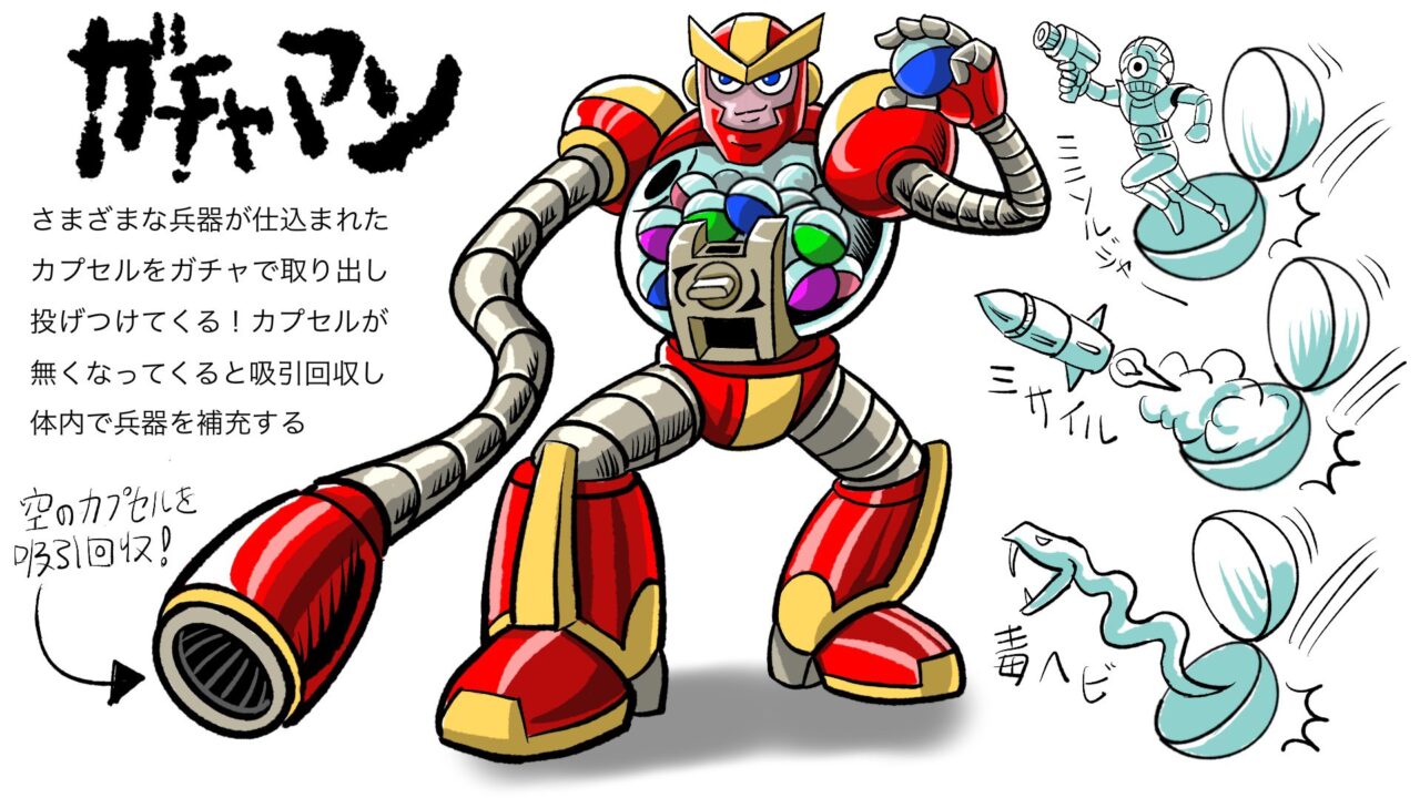 Imammura has designed a character called Gachaman for the art contest in hopes that it makes the cut for Mega Man Dual Override, the art for which you can see above.