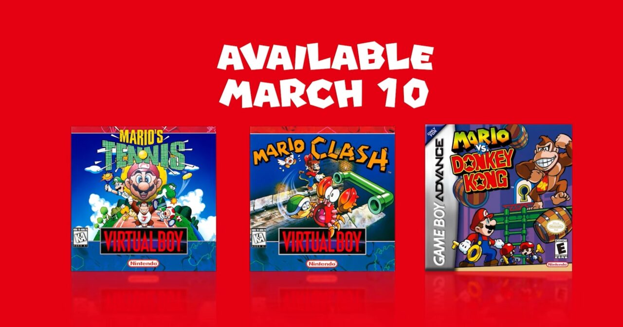 Mario’s Tennis and Mario Clash will join the Virtual Boy app library while Mario vs. Donkey Kong will come to the GBA Nintendo Classics app.